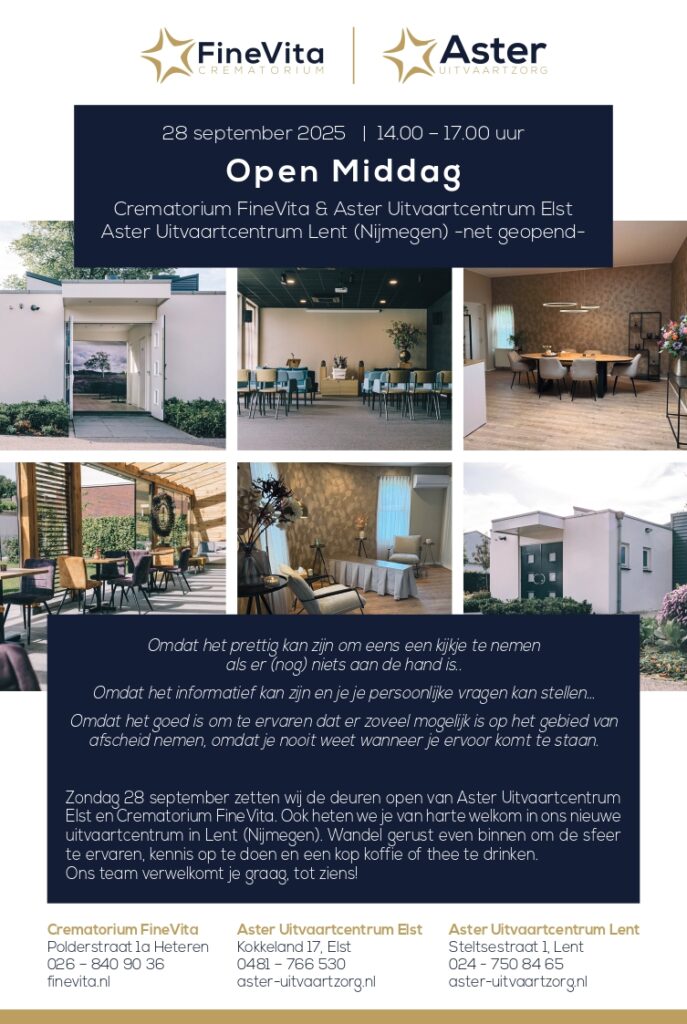 Samen herinneren door licht te ontsteken, naar muziek en mooie woorden te luisteren. Ieder die dat wil, mag een naam opgeven van een geliefde die wordt gemist, om deze nog eens te laten klinken. Een moment van aandacht, met na afloop koffie, thee en warme chocolademelk. - Open Middag Crematorium FineVita, Aster Uitvaartcentrum Elst & Nijmegen